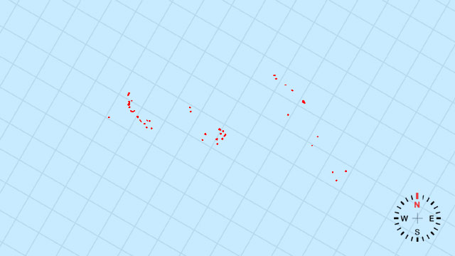 [D] Kiribati | Kiribati's map outline is characterized by its dispersed nature, consisting of 32 atolls and one raised coral island spread over a vast area of the Pacific Ocean.